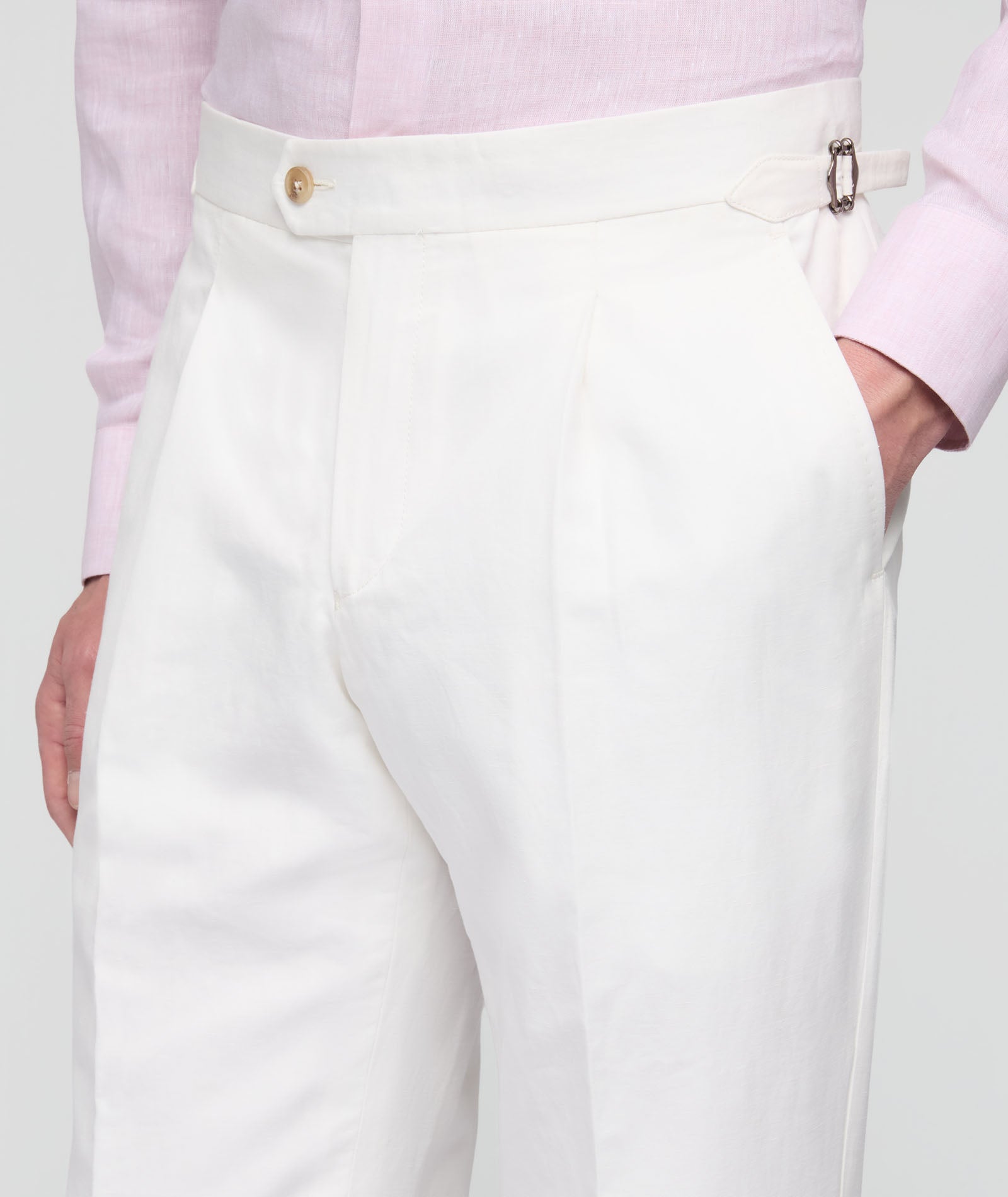 Este traje a medida está confeccionado en Italia con un tejido blanco de lino-algodón de la fábrica de lino Zignone. El lino de algodón es fresco y ligero. Perfecto para el tiempo libre y para un look veraniego sofisticado también adecuado para ceremonias junto al mar.