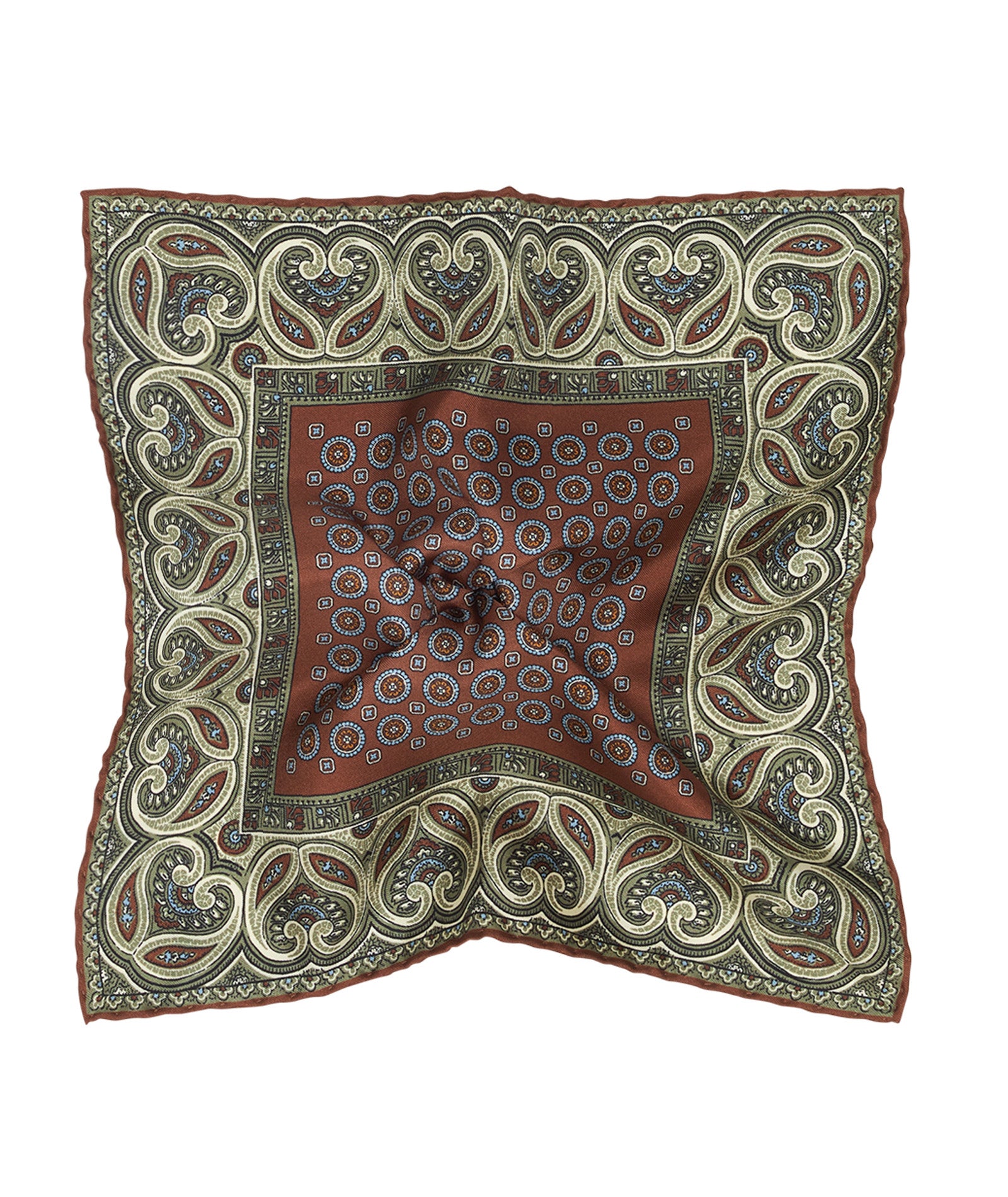 Pochette en soie à motifs cachemire et médaillons dans les tons bordeaux et sauge. De forme carrée, c'est un accessoire à porter avec nonchalance dans la poche d'un blazer.